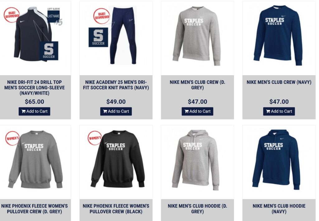 Thanks to the program’s spending on unfiorms and practice gear, Nike provides an aggressive discount. The Staples Boys Soccer Foundation — operators of the online story — pass the discount on to buyers. Even with the costs of printing and embroidery, most items sell well below retail prices. $5 has been added to each item, to help support Staples boys soccer.