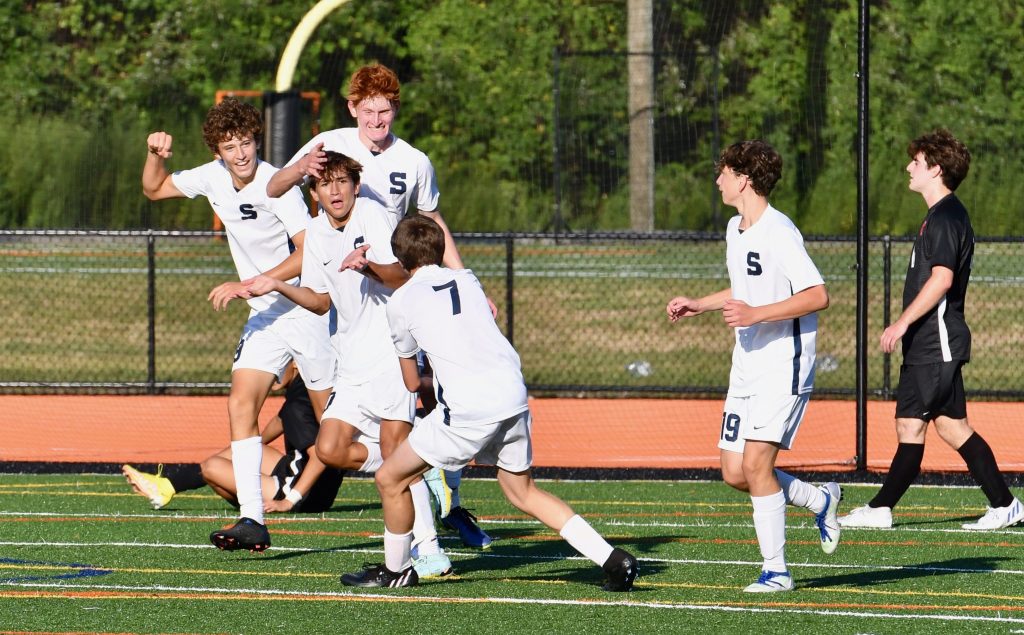 Avery Mueller (center) celebrates his goal at Ridgefield with (from left) Lucas Carpi, Dylan Hoke and Sam Rossoni. Zach Gorin (19) will join soon. (Photo/Mark Sikorski)