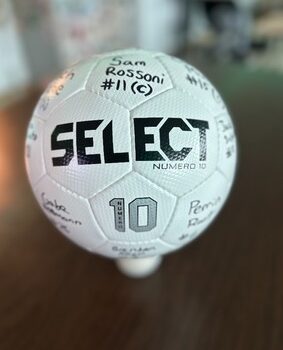 Items include soccer training with varsity players (for goalkeepers too!), a ball signed by the ’25 varsity team (similar to the ’24 one shown above), a ski on/off weekend at Stowe, Knicks tickets, diamond earrings, writing consultations with Dan Woog, and much more.