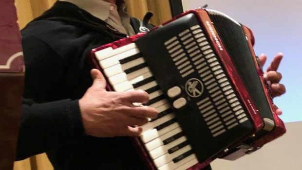 Assistant coach Kurt Dasbach uses an accordion to entertain — and demonstrate Staples soccer’s philosophy of transitions from offense to defense.