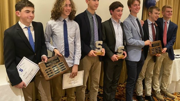 From left: Stephen Martin Award winners Alex Laskin, Josh Deitch; Block “S” Most Improved Benny Feuer; Block “S” Patricio Perez Elorza; Alumni Award winners Emerson Anvari, Colin Corneck, Carter Bassler. (Photo/Nicole Laskin)