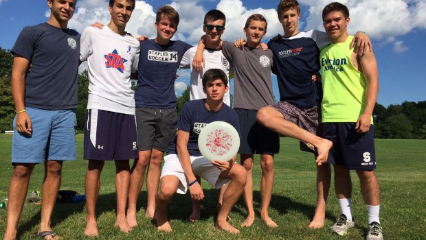 Getting ready for some ultimate frisbee: front, Andres Marmelo. Rear: Noah Schwaeber, Luca Cocito, Matteo Broccolo, Aidan Wisher, Daniel Reid, Ziggy Hallgarten, Kenji Goto.