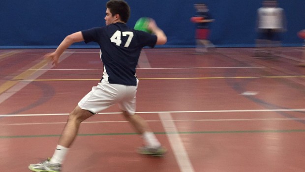 Josh Berman was on all 5 winnning teams, in this afternoon’s dodgeball tournament. The games — the 3rd in this year’s Jack Scott Octathlon of Champions — featured different teams each round. Organizer Daniel Perez Elorza broke them down by various criteria: defenders vs. attackers; players who were on varsity as sophomores vs. those who were not, etc. The final match involved kicking only — no throwing.