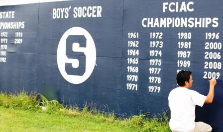 Ernesto of William Evans Painting puts the finishing touches (above) on the Staples boys soccer kickboard. For the 1st time since 1981, 2 titles were added at once: FCIAC and state champions.