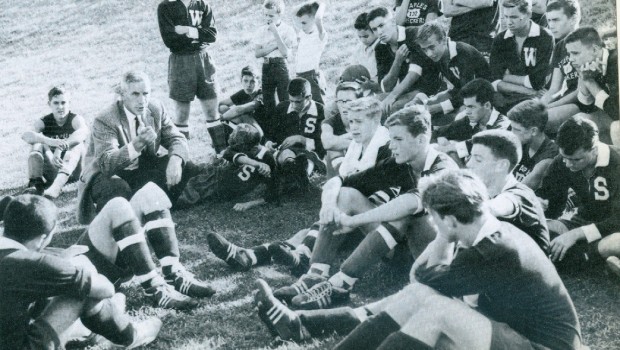 Albie Loeffler talks with one of his mid-1960s teams. All players — from every team — are welcome to play in the indoor tournament.