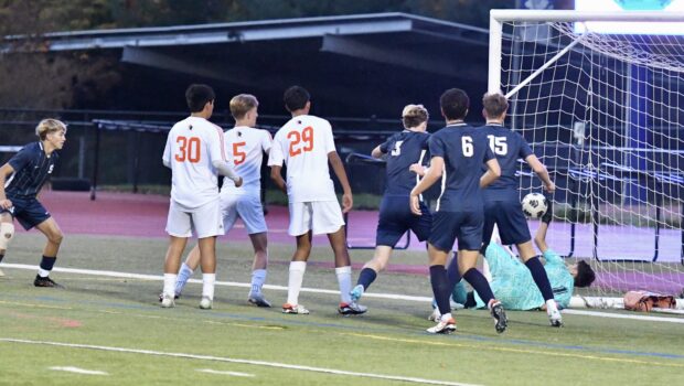 Avery Mueller (far left) scores a header against Stamford. Keeper Christian Vitti attempts a save, but the ball was already over the line. Cormac Mulvey, Adam Syah and Santi Alfageme are ready to pounce on any rebound. (Photo/Mark Sikorski)