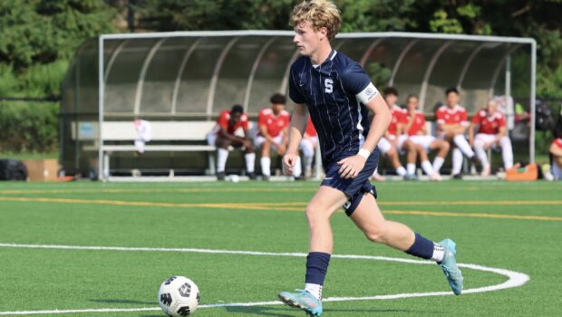 But the well-drilled team showed no signs of nerves or worries, at the opening whistle. Barely 1 minute had elapsed when Jonny Costello stole a ball near the penalty area, and found Duque. The junior — starting his first varsity match — finished cleanly, into an open net.