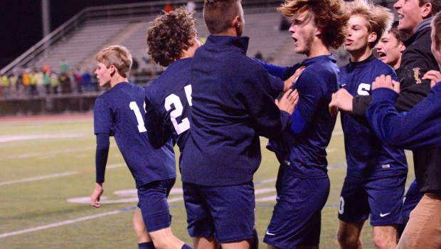 Teddy Lawrence (center) is mobbed by his Staples teammates, after scoring the tying goal at Norwalk. Just over 5 minutes remained. (Photo/Frances Rowland)