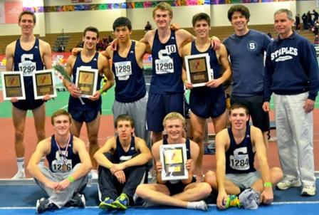 The Staples indoor track team at the New England championship. Front row (from left): David Hoffman, Mik Kulis, Walker Marsh, Kyle Hoberman. Back row: Henry Wynne, Jon Heil, Zach Mitchell, Max Hoberman, coaches Malcolm Watson and Laddie Lawrence. (Photo/StaplesRunning.com)