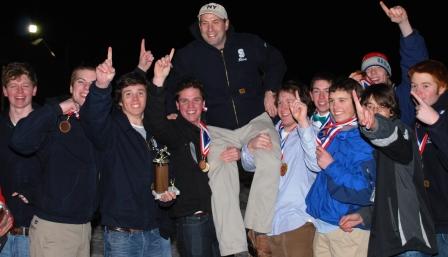 The victorious Staples High School ski team. Mikey Scott is on the right side, wearing a bright blue jacket, a medal and a broad smile. (Photo by Ned Hardy)