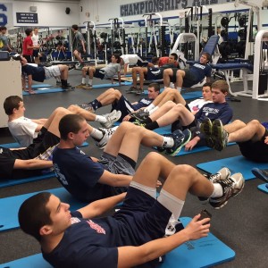 The off-season fitness program began this morning at 6 a.m. A record turnout of 39 players — including 9 juniors, 18 sophomores and 12 freshmen — braved the pre-dawn cold to begin strengthening their core, increasing [&hellip... Read More →