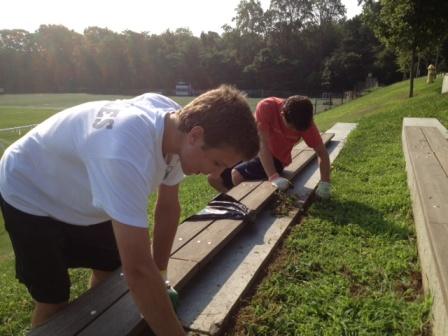 Blistering heat and high humidity — plus blistering hands — did not deter several varsity players and their parents this morning. They worked for several hours in the hot sun, weeding and washing the terrace at Loeffler Field to get it ready for the 2012 season.