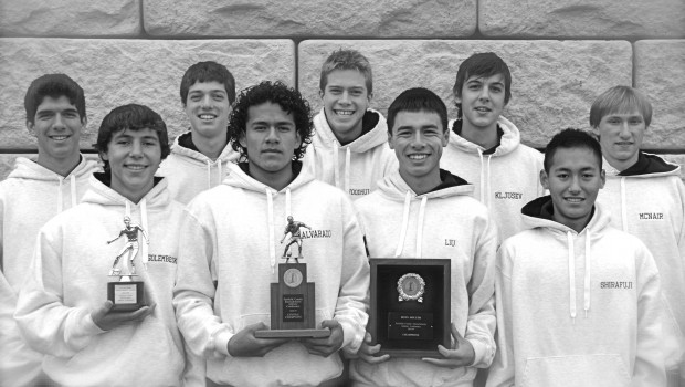 Staples seniors pose proudly with their hardware (FCIAC championship, Ralph King Cup, Central Division championship). From left: Frankie Rende, Jon Golembeski, Alex Hoberman, Jairo Alvarado, Rem Woodhull, Adam Liu, Nick Kljusev, Kenta Shirafuji, Sanders McNair. (Photo by Carl McNair)