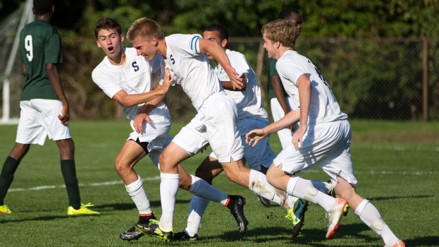 Andrew Puchala (center) celebrates his go-ahead goal against Bassick. Nate Argosh, Denzel Robinson and Patrick Beusse share his joy. (Photo/Kim Lake)