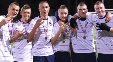 6 of the 7 seniors who have 3-peated: Steven Denowitz, Mikey Scott, Frankie Bergonzi, Jake Krosse, Sean Gallagher and Brendan Lesch. Greg Gudis, the 7th senior, was being interviewed when the photo was taken. (Photo by Lisa Krosse)