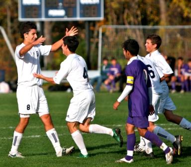 Good friends Frankie Bergonzi and Brendan Lesch have obviously spent quality time rehearsing their goal-scoring celebration. (Photo by Lisa Krosse)