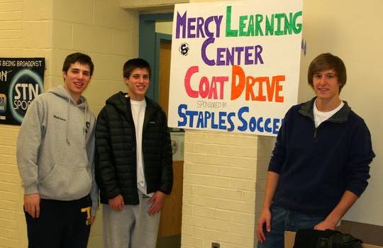 When the 3 juniors heard that Dr. Gerald Kuroghlian — their freshman English teacher — was volunteering at the renowned Bridgeport center, and was trying to find coats for kids and moms, they offered to help. They spearheaded a collection effort at tonight’s boys basketball game, yielding several overflowing boxes.
