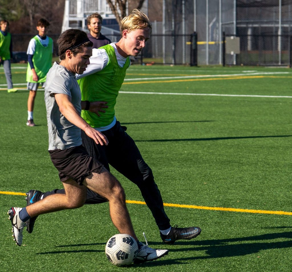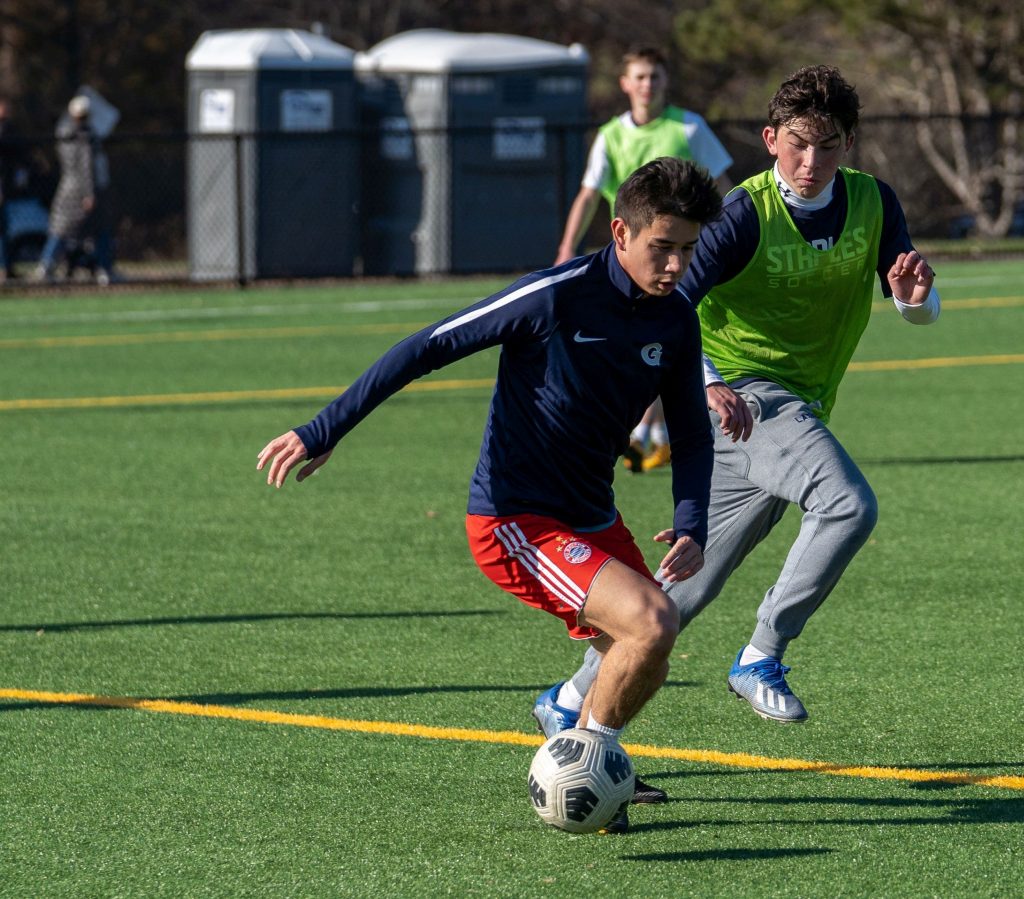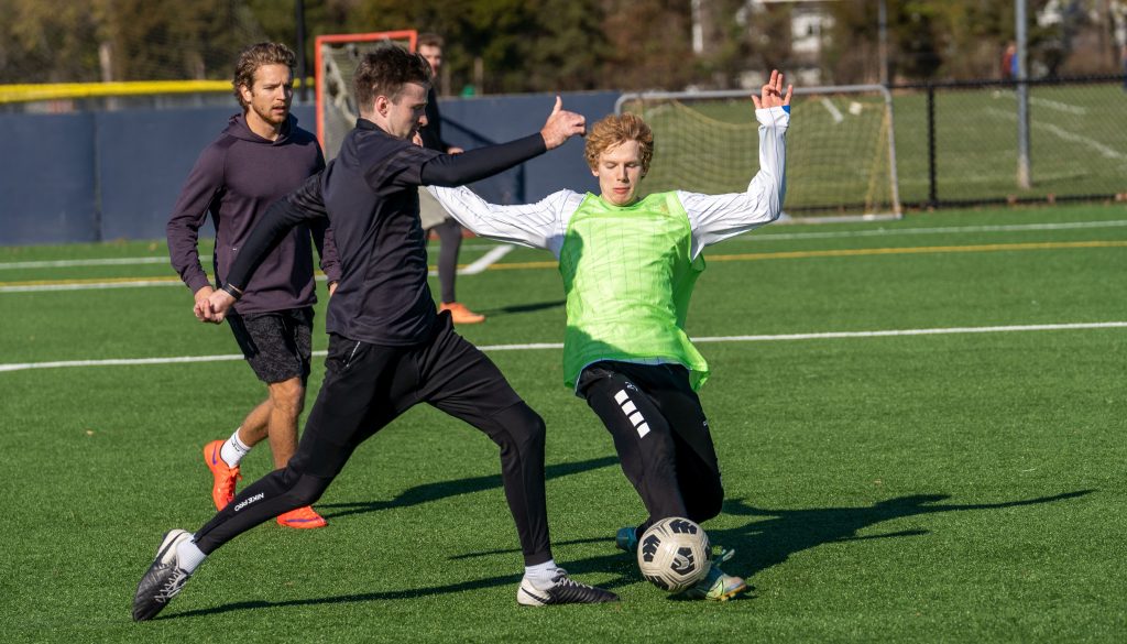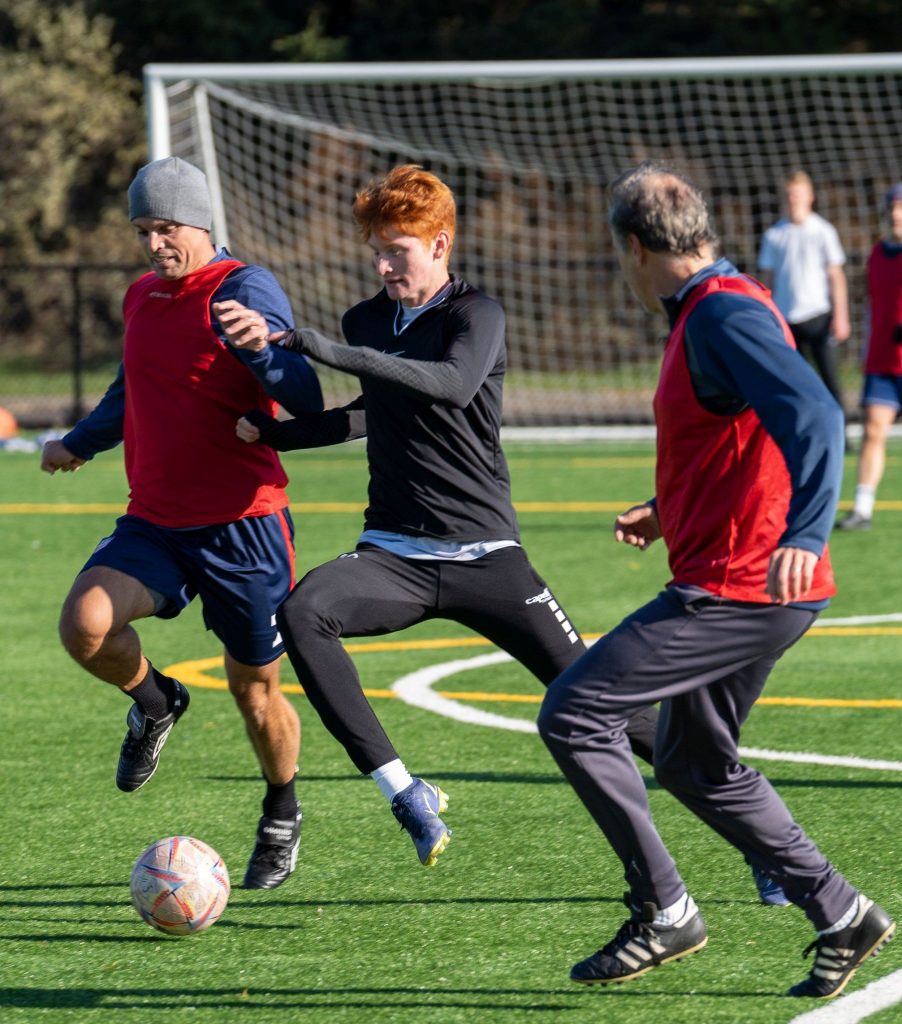 Dylan Hoke ’24, tries to weave through Jim Wolf ’01 and Seth Sholes ’78. Wolf — now president of the Westport Soccer Association — played at Lehigh University. Sholes was an All-American at Wesleyan University. (Photo/Barry Guiduli)