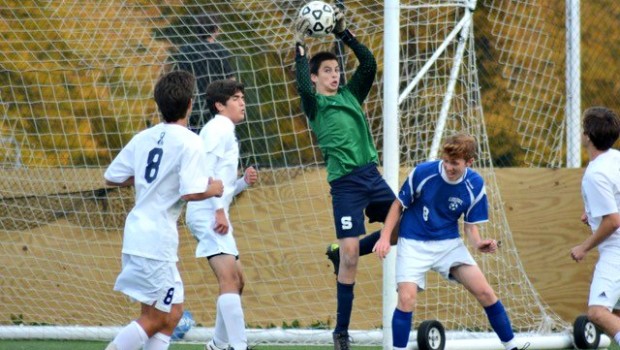 Keeper Thomas Heisler — shown here in action last fall for Staples’ reserves — was the star of the U-18 elite team’s state cup penalty kick win.