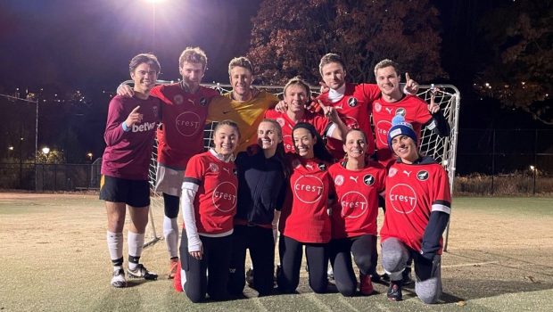 A group of Staples soccer players — all now living in New York — forms the core of a team competing in a coed league at FDR Park on the East Side.