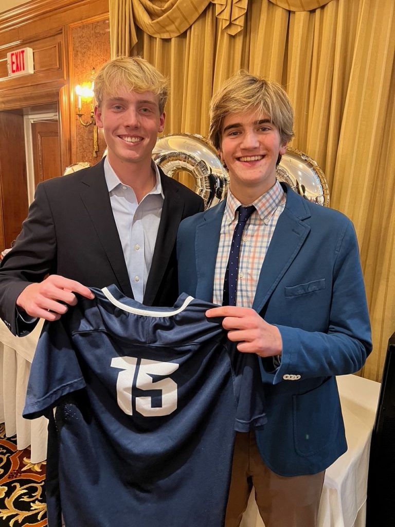 Senior Ben Douglas continued the tradition of handing down jersey #15. Current junior Santi Alfageme will wear it next fall. The jersey honors Preston Hirten ’07, who wore it with passion and pride. He died of an undiagnosed heart condition on the first day of preseason training at the University of Mary Washington, in 2008.