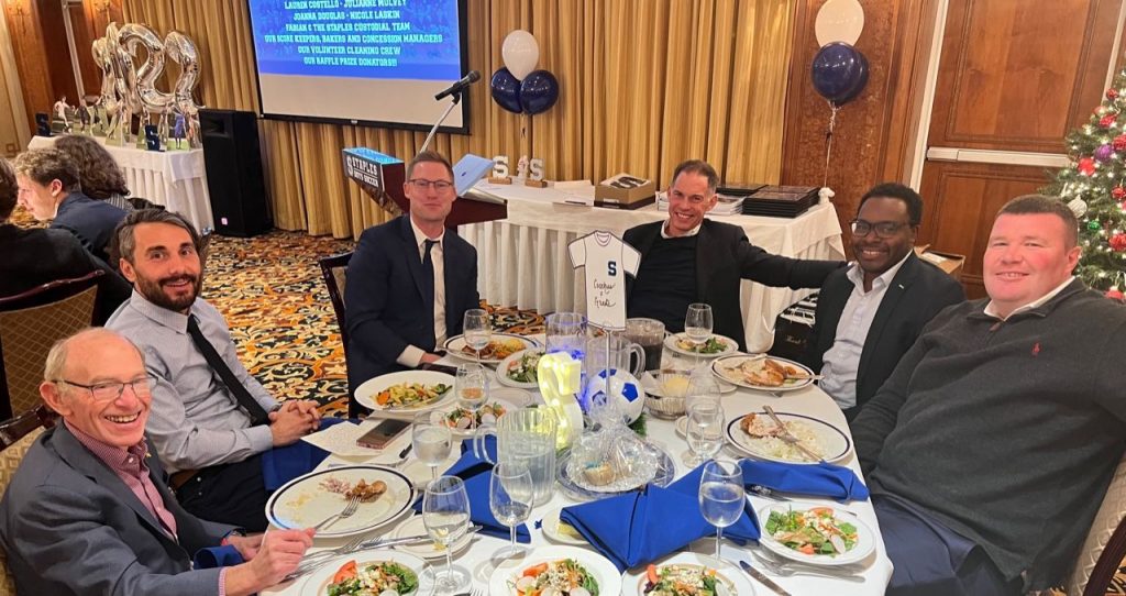 Head table, clockwise from lower left: former head coach Dan Woog, JV coach Stel Sefiridis, head coach Russell Oost-Lievense, goalkeeper coach Jim St. Andre, freshman coach Elisee Joseph, varsity assistant coach Chris Flaherty. (Photo/Joanna Douglas)