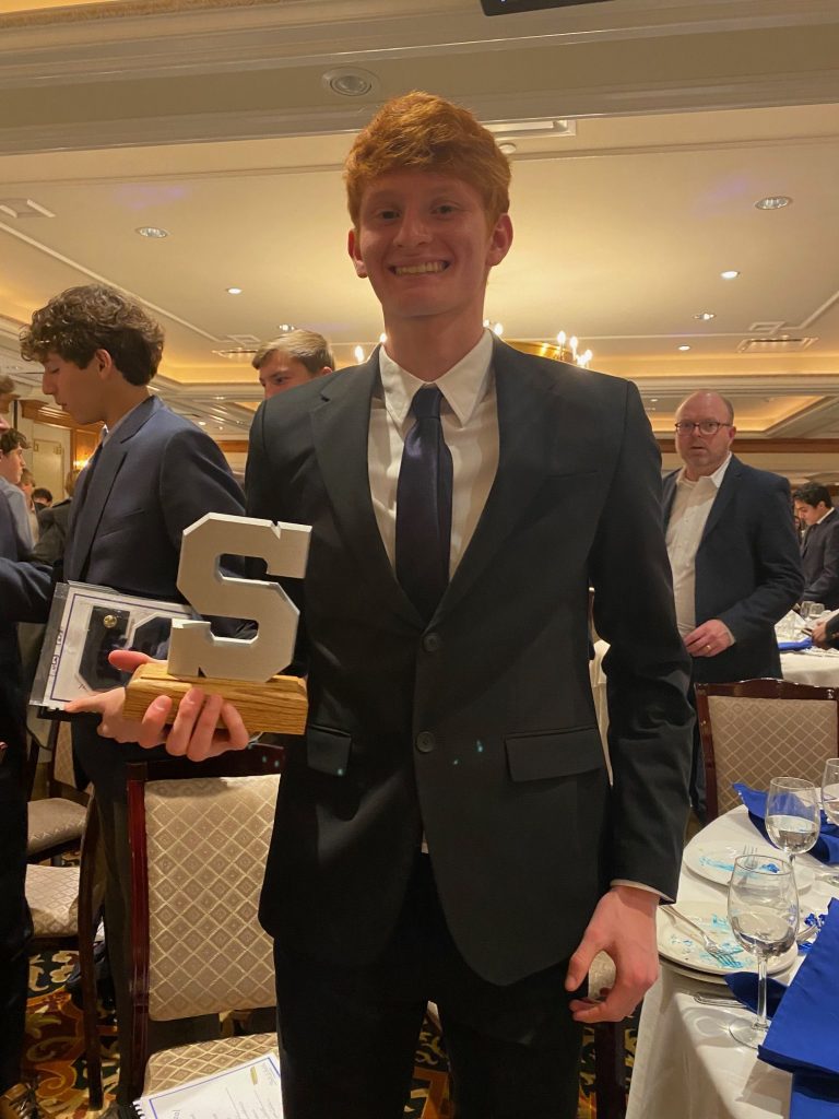 Dylan Hoke, with his Block “S” for Most Valuable Player. (Photo/Dan Woog)