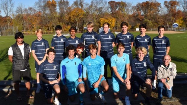 xThe 2020 seniors. Front row (from left): Aaron Jaffe, Reed Caney, George Smith, Enzo Valadares, Sebi Montoulieu, Alan Fiore, head coach Dan Woog. Back row: Assistant coach Kurt Dasbach, Zach Pulichino, Marcos Inglada, Surya Balaji, Jack Douglas, Kyle Rotolo, Haydn Soroka, Haran Eiger, Graham Barnes. (Photo/Drew Douglas)