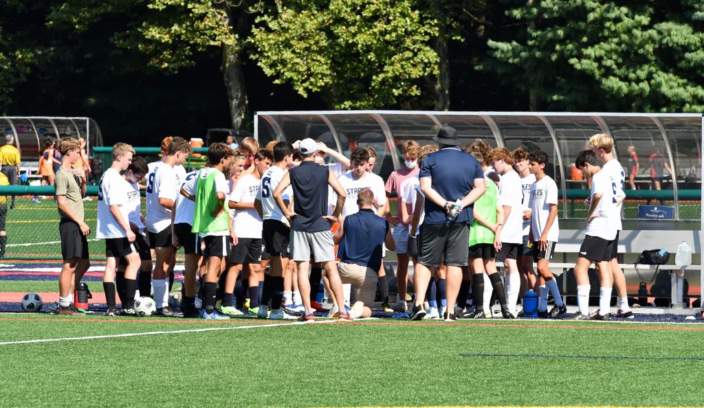 Head coach Russell Oost-Lievense (kneeling), flanked by keeper coach Jim St. Andre and assistant Chris Flaherty, talk to the squad at Greens Farms Academy. (Photo/Mark Sikorski)
